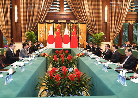 李克強表示,當前中日關係總體保持改善發展勢頭,這一局面來之不易。中方重視中日關係,習近平主席在北京會見了你。雙方應恪守中日四個政治文件確立的各項原則,繼續本著以史為鑒、面向未來的精神,立足當前,著眼長遠,妥善處理敏感問題,推動兩國關係在重回正軌的基礎上不斷實現新的發展。去年我訪問日本期間,首相先生陪同我訪問了北海道。我今天在成都都江堰同你會談,也是盡地主之誼。希望日方同中方相向而行,為雙方開展更多高層交往營造良好條件和氛圍。