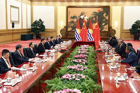 習近平強調,雙方要深化政治互信。中方一貫堅持大小國家一律平等,各國應該相互尊重主權和領土完整,平等相待。中國堅持走和平發展道路,不搞“國強必霸”,不干涉別國內政,同時也不允許別國干涉中國內政。中方尊重基方自主選擇符合自身國情的發展道路,願同基方加強高層和各級別交往,分享治國理政經驗。此次兩國簽署了共建“一帶一路”諒解備忘錄等文件,要將共建“一帶一路”倡議同“基里巴斯20年發展規劃”相對接,拓展務實合作。中方願鼓勵更多中國企業赴基里巴斯投資興業。中方已經批准基里巴斯為中國公民組團出境旅遊目的地國,雙方可加強人文交流和地方合作。中方願同基方在聯合國、太平洋島國論壇等多邊機制內加強溝通合作,繼續在南南合作框架內為基方應對氣候變化提供支持幫助,維護發展中國家共同利益。
