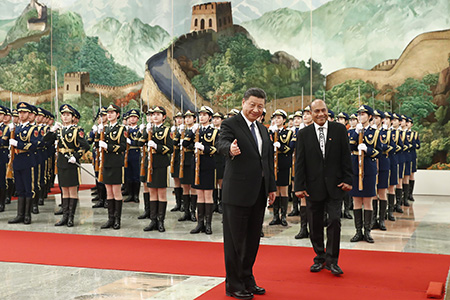 會談前,習近平在人民大會堂北大廳為馬茂舉行歡迎儀式。彭麗媛、楊潔篪、吉炳軒、王毅、何立峰、劉新成等參加。