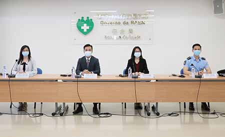 昨日新型冠狀病毒感染應變協調中心舉行例行記者會,仁伯爵綜合醫院醫務主任羅奕龍、旅遊局執照及監察廳廳長陳露、治安警察局公共關係處處長李德輝、疾病預防控制中心傳染病防制暨疾病監測部協調員梁亦好共同會見傳媒。