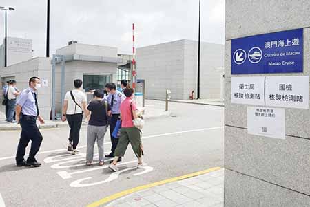 珠海昨日(八日)起取消口岸核酸檢測採樣,澳門特區政府在氹仔客運碼頭(港口管理大樓入口)提供的核酸檢測服務,昨日中午十二時起亦擴展至有通關需要的澳門居民,除七十歲以上的長者可豁免預約外,其餘人士均需預約方能入內,在氹仔碼頭,有工作人員要求到場人士出示預約證明、身份證等資料,並為他們量體溫。有居住北區的市民稱,因未進行預約而白行一趟,有市民認為,氹仔客運碼頭位置偏遠,乘坐巴士耗時需近一小時,而且現場周圍標示不夠清晰,感到十分不便。