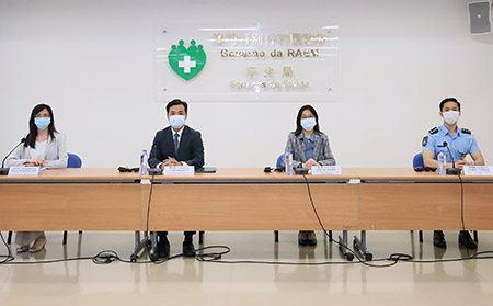 昨日新型冠狀病毒感染應變協調中心舉行例行記者會,仁伯爵綜合醫院醫務主任羅奕龍、旅遊局執照及監察廳廳長陳露、治安警察局公共關係處處長李德輝、疾病預防控制中心傳染病防制暨疾病監測部協調員梁亦好共同會見傳媒。