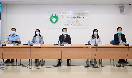 昨日新型冠狀病毒感染應變協調中心舉行例行記者會,仁伯爵綜合醫院醫務主任羅奕龍、旅遊局執照及監察廳廳長陳露、教育暨青年局中學暨技術職業教育處處長梁怡安、治安警察局公共關係處處長李德輝、疾病預防控制中心傳染病防制暨疾病監測部協調員梁亦好共同會見傳媒。