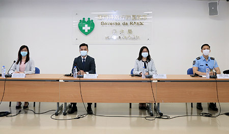 昨日新型冠狀病毒感染應變協調中心舉行例行記者會,仁伯爵綜合醫院醫務主任羅奕龍、旅遊局執照及監察廳廳長陳露、治安警察局公共關係處處長李德輝、疾病預防控制中心傳染病防制暨疾病監測部協調員梁亦好共同會見傳媒。