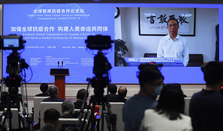 【中新社北京6月10日電】全球智庫抗疫合作雲論壇于北京時間6月9日至10日舉行。本次雲論壇以“加強全球抗疫合作 構建人類命運共同體”為主題,來自48個國家和9個國際組織的160余位智庫和媒體代表通過視頻連線,就加強各國團結合作,構建人類衛生健康共同體深入交流探討,達成廣泛共識。