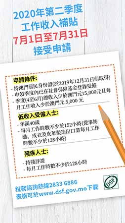 【特訊】2020年第二季工作收入補貼將於7月1日至7月31日接受申請,本年度申請對象放寬至澳門非永久居民。凡年滿四十歲、於申領補貼季度內已在社會保障基金登錄為受僱人士,以及持澳門特別行政區居民身份證(須於2019年12月31日或以前取得),只要每月工作不少於152小時,或從事紡織、成衣及皮革產品製造出口業每月工作不少於128小時,且該季度工作收入少於澳門元15,000元及每月工作收入少於澳門元5,000元,均可申請工作收入補貼。