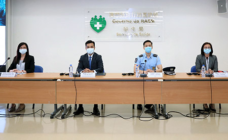 昨日新型冠狀病毒感染應變協調中心舉行例行記者會,仁伯爵綜合醫院醫務主任羅奕龍、治安警察局公共關係處處長李德輝、旅遊局公共關係處處長劉鳳池、疾病預防控制中心傳染病防制暨疾病監測部協調員梁亦好共同會見傳媒。