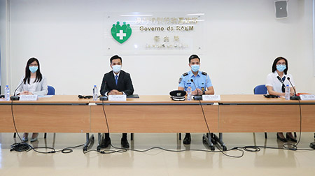 昨日新型冠狀病毒感染應變協調中心舉行例行記者會,仁伯爵綜合醫院醫務主任羅奕龍、治安警察局行動及通訊處處長馬超雄、旅遊局公共關係處處長劉鳳池、疾病預防控制中心傳染病防制暨疾病監測部協調員梁亦好共同會見傳媒。