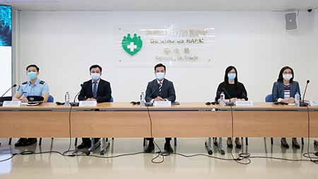 昨日新型冠狀病毒感染應變協調中心舉行例行記者會,仁伯爵綜合醫院醫務主任羅奕龍、教青局教育廳廳長黃嘉祺、治安警察局行動及通訊處處長馬超雄、旅遊局公共關係處處長劉鳳池、疾病預防控制中心傳染病防制暨疾病監測部協調員梁亦好共同會見傳媒。