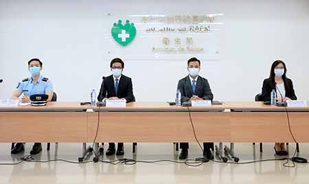 昨日新型冠狀病毒感染應變協調中心舉行例行記者會,旅遊局副局長程衛東、仁伯爵綜合醫院醫務主任羅奕龍、治安警察局公共關係處處長李德輝、疾病預防控制中心傳染病防制暨疾病監測部協調員梁亦好共同會見傳媒。