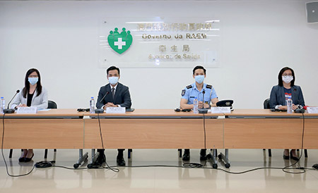 昨日新型冠狀病毒感染應變協調中心舉行例行記者會,仁伯爵綜合醫院醫務主任羅奕龍、治安警察局公共關係處處長李德輝、旅遊局公共關係處處長劉鳳池、疾病預防控制中心傳染病防制暨疾病監測部協調員梁亦好共同會見傳媒。