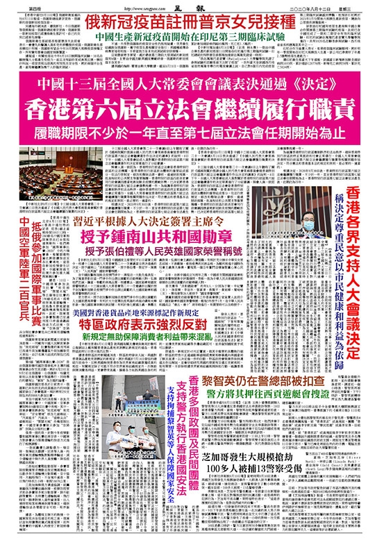 【香港中通社8月11日電】中國十三屆全國人大常委會第二十一次會議8月11日表決通過了《全國人民代表大會常務委員會關於香港特別行政區第六屆立法會繼續履行職責的決定》。