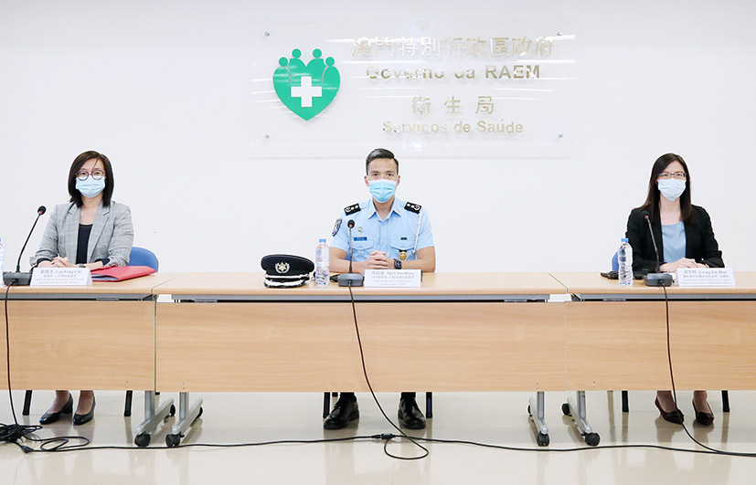昨日新型冠狀病毒感染應變協調中心舉行例行記者會,治安警察局行動及通訊處處長馬超雄、旅遊局公共關係處處長劉鳳池、疾病預防控制中心傳染病防制暨疾病監測部協調員梁亦好共同會見傳媒。