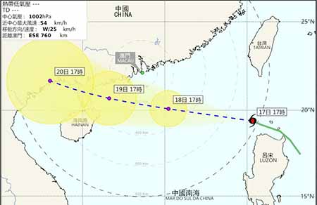 氣象局表示,位於南海北部的熱帶低氣壓目前正以偏西方向移動,大致趨向廣東西部沿岸。預料該熱帶低氣壓將進一步發展,並於週二(十八日)晚間至週四(二十日)為本澳帶來不穏定天氣,屆時本澳將有較頻密的驟雨及雷暴,風力達到強風程度及有陣風。今晚(十八日)至明日(十九日)清晨發出三號風球的可能性高。