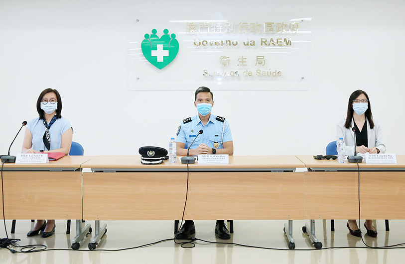 昨日新型冠狀病毒感染應變協調中心舉行例行記者會,治安警察局行動及通訊處處長馬超雄、旅遊局公共關係處處長劉鳳池、疾病預防控制中心傳染病防制暨疾病監測部協調員梁亦好共同會見傳媒。