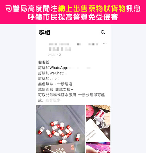 【特訊】司警局早前進行網巡及接獲市民反映,獲悉有人在多個網絡社交平台上發佈訊息售賣名為「啪啪粉」的藥物狀貨品,聲稱能達到迷幻、忘我等效果,為此本局開立卷宗進行調查。