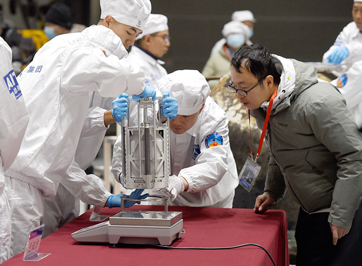 11月24日,嫦娥五號探測器發射入軌,經歷地月轉移、近月制動、兩兩分離、平穩落月、鑽表取樣、月面起飛、交會對接及樣品轉移、環月等待、月地轉移、再入回收等階段,在軌工作23天後,返回器攜帶月球樣品於12月17日在內蒙古四子王旗預定區域著陸,任務取得圓滿成功。此後,嫦娥五號返回器安全運抵北京,完成了開艙及相關處理工作,科技人員順利取出了月球樣品容器。