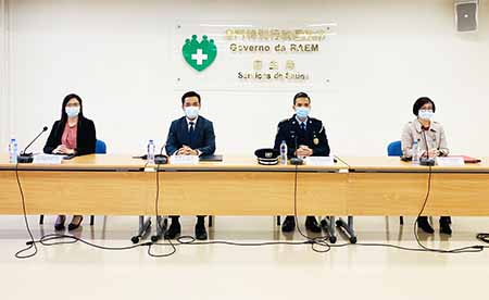 新型冠狀病毒感染應變協調中心昨日舉行例行記者會,仁伯爵綜合醫院醫務主任羅奕龍、治安警察局行動及通訊處處長馬超雄、旅遊局公共關係處處長劉鳳池、疾病預防控制中心傳染病防制暨疾病監測部協調員梁亦好共同會見傳媒。