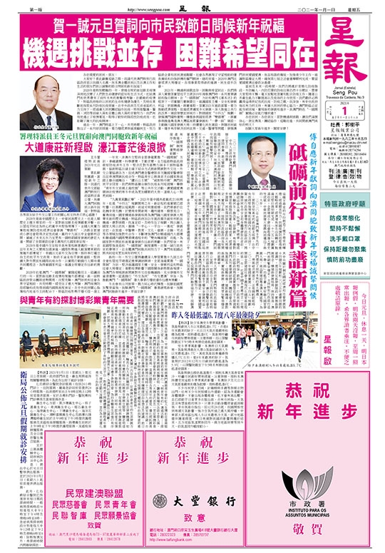 乘風破浪潮頭立,正是揚帆啟航時。二○二一年是國家實施「十四五」規劃、開啟全面建設社會主義現代化國家新征程的第一年,也是中國共產黨成立一百周年。我們相信,新的一年,行政長官和特別行政區政府將認真貫徹習近平主席視察澳門系列重要講話精神,團結社會各界,強基固本、迎難而進,搶抓新機遇,應對新挑戰,實現新發展,續寫更加繁榮穩定的新篇章。
