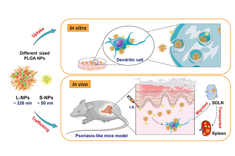 鄭穎團隊針對此進行研究,團隊體外實驗結果顯示,樹突狀細胞系更偏向於攝取大粒徑納米粒。體內實驗結果則顯示,僅僅只靠塗抹,藥物納米粒很難穿過皮膚角質層,而經過皮內注射的辦法,發現小粒徑納米粒更容易轉運進皮膚引流淋巴結,並且納米粒在經過8小時體內轉運之後,於皮膚及淋巴結中仍有部分能保持完整性。此外,在攝取了納米粒的細胞群中,樹突狀細胞在大粒徑的小鼠組的比例更高,說明樹突狀細胞在體內也更傾向於攝取大粒徑細胞。總的來說,皮膚及淋巴系統對於納米粒的攝取及轉運在免疫相關皮膚疾病的治療中起著關鍵作用,而藥物載體粒徑大小對其有一定影響,通過本研究,可以為藥物研發提供新思路。