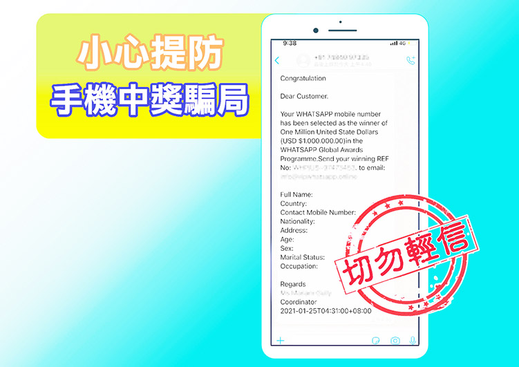 【特訊】昨日,司法警察局接獲「司警局婦女防罪之友」會員舉報,指其手機WhatsApp帳號收到一條來歷不明的英語訊息,內容稱其WhatsApp手機號碼在WhatsApp全球獎勵計劃中被選為100萬美元的獲獎者,並要求該會員將獲獎編號連同姓名、國籍、聯絡電話、年齡、性別及住址等個人資料電郵至指定電子郵箱,以領取獎金。由於近日司警局曾發出警情通告提醒 市民防範手機通訊軟件詐騙,故其有所警惕,沒有上當,並馬上向司警局作出舉報。