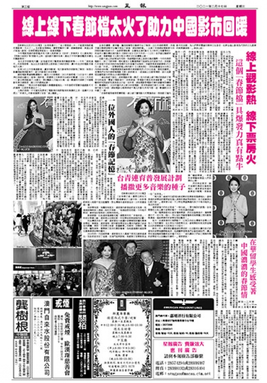 ——票房牛!「春節檔」首日票房超17億元創紀錄。國家電影局13日下午發佈數據顯示,2021年2月12日正月初一全國電影票房超過17億元,刷新了2019年創造的14.43億元的正月初一單日票房紀錄。燈塔專業版數據也顯示,「春節檔」首日觀影總人次達3403萬,同樣創造了中國影史單日人次的新紀錄。