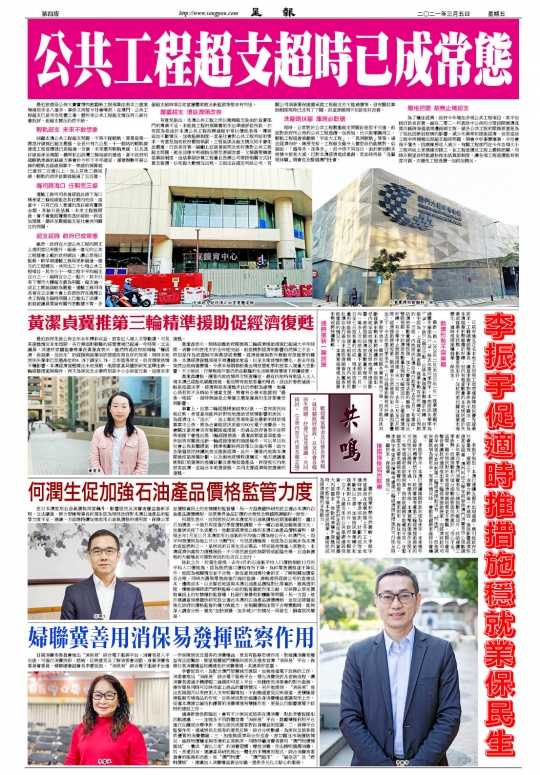 鑒於就業形勢依然嚴峻,李振宇希望當局在就業政策上多下工夫,如適時檢討“帶津培訓”計劃的成效並不斷加以完善,加強居民職業轉介和就業配對工作。另外,政府今年撥款一百八十五億元用於公共基礎建設投資,李振宇希望政府在利用相關投資擴大內部需求、推動經濟穩步復甦的同時,亦能促進本地居民就業,讓居民成為經濟復甦的主推動力。