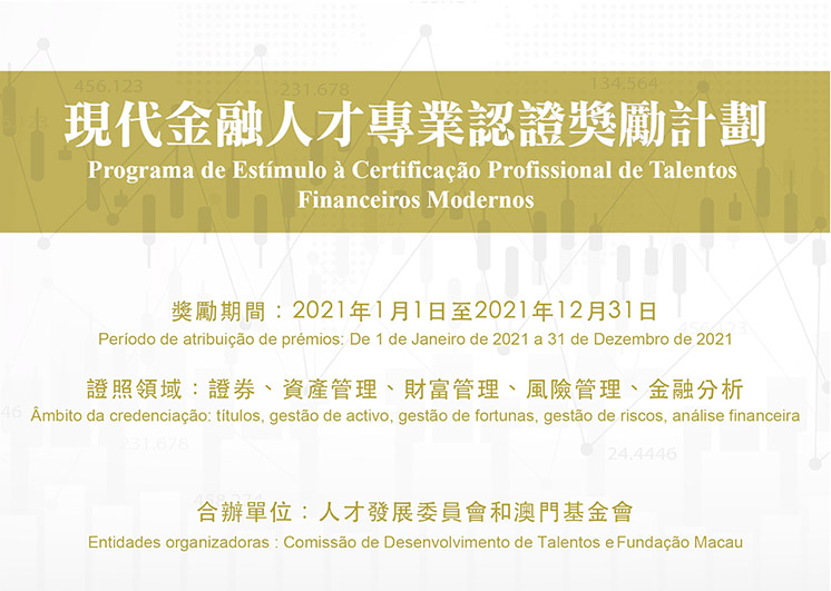 「現代金融人才專業認證獎勵計劃」旨在推動澳門居民考取與證券、資產管理、財富管理、風險管理及金融分析相關專業認證;對於難度較高考試,獎勵由最低級起逐步向最高級別推進,計劃首年先由初級起按年上延至各個級別,藉此為業界儲備各類具專業認證資格的金融人才。