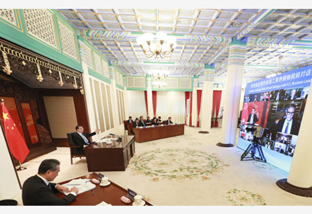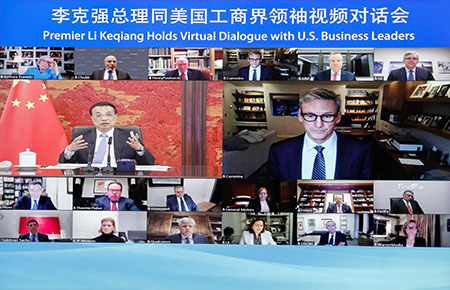 【中新社北京4月13日電】 中國國務院總理李克強4月13日在中南海紫光閣出席同美國工商界領袖視頻對話會。美中貿易全國委員會和20餘家美國知名跨國公司董事長和首席執行官參加。李克強同他們互動交流,併回答提問。美國前財政部長、鮑爾森基金會主席亨利·鮑爾森主持。