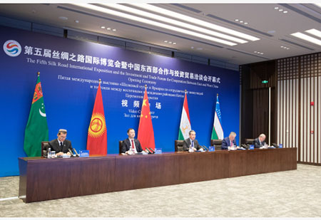 王毅還同吉爾吉斯斯坦、塔吉克斯坦、土庫曼斯坦、烏茲別克斯坦外長共同為第五屆絲博會中亞館舉行線上開館儀式,並線上參觀絲博會展館。