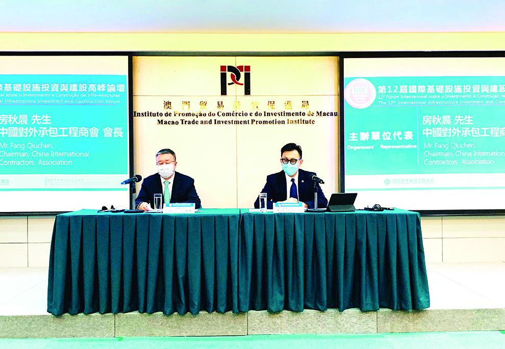 主辦單位昨日舉行新聞發佈會,中國對外承包工程商會會長房秋晨、澳門貿易投資促進局主席劉偉明出席介紹論壇詳情。