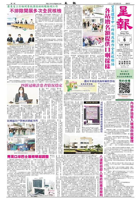 治安警察局行動及通訊處處長馬超雄表示,因應疫情變化和防疫工作需要,自四日早上八時至昨早八時,警方額外抽調約1,500名警員維持全澳核酸檢測站秩序,並在連勝街和義字街2個防控區布置警力管控出入,協助衛生部門開展核酸檢測、追蹤和查找密切接觸者和次密切接觸者以及維生支援等工作。司警局亦派出420人,海關135人、消防230人協助有關防疫工作。