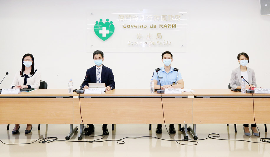 新型冠狀病毒感染應變協調中心昨日舉行記者會,仁伯爵綜合醫院醫務主任戴華浩、旅遊局公共關係處處長藍同好、治安警察局公共關係處處長李德輝、疾病預防控制中心傳染病防制暨疾病監測部協調員梁亦好共同會見傳媒。