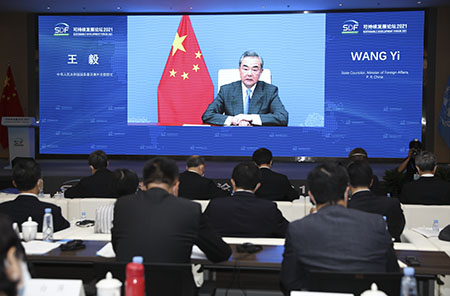 【中新社北京9月26日電】(記者 阮煜琳)中國國務委員兼外交部長王毅26日以視頻方式出席2021年可持續發展論壇開幕式並發表主旨演講。