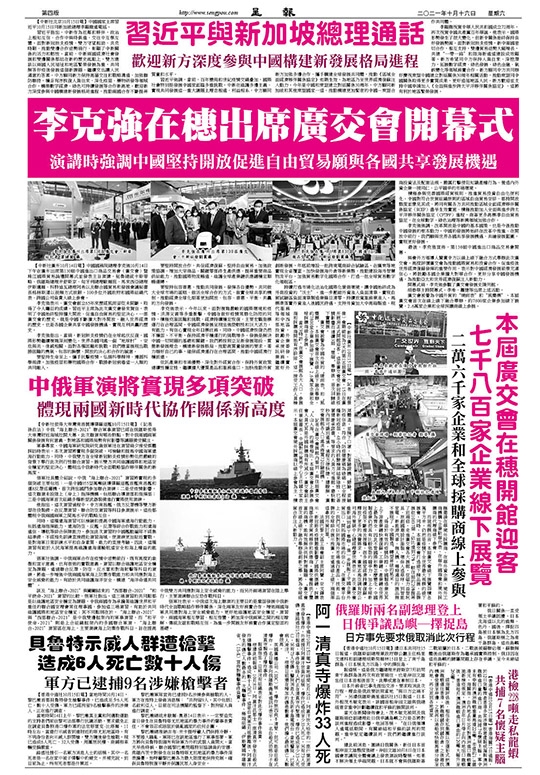【中新社廣州10月14日電】中國國務院總理李克強10月14日下午在廣州出席第130屆中國進出口商品交易會(廣交會)暨珠江國際貿易論壇開幕式並發表主旨演講。秘魯總統卡斯蒂略、俄羅斯總理米舒斯京、匈牙利總理歐爾班、馬來西亞總理伊斯邁爾、科特迪瓦總理阿希以及聯合國貿易和發展會議秘書長格林斯潘以視頻方式致辭。100多位外國政府和國際組織代表、跨國公司負責人線上參會。