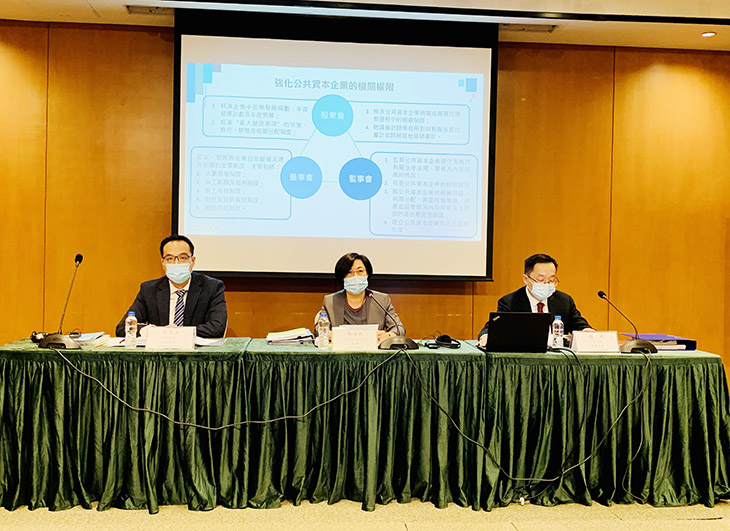 公共資產監督規劃辦公室昨日在科學館會議中心舉行新聞發佈會,主任陳海帆、副主任廖志漢和職務主管趙淵介紹《公共資本企業法律制度》諮詢文本的內容。