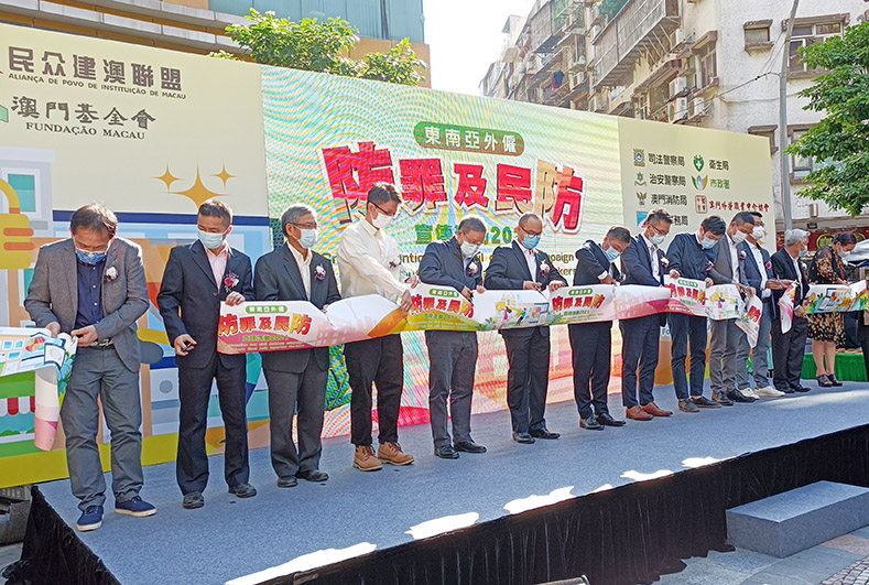 「東南亞外僱防罪及民防宣傳活動2021」昨日假三盞燈圓型地舉行,司法警察學校校長孫錦輝、治安警察局代廳長黃超文、消防局代廳長陳明、衛生局疾病預防控制中心主任林松、勞工局處長黎家澧、市政署處長歐偉新等嘉賓出席主禮。