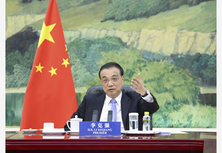 李克強在致辭時表示,當前全球疫情仍在起伏反復,世界經濟復蘇動力較弱,不穩定不確定因素增多。習近平主席提出構建人類命運共同體。中方願與各方攜手合作抗擊疫情,推動經濟恢復,保持產業鏈供應鏈穩定暢通。堅定維護以聯合國憲章為基礎的國際關係基本準則,維護以世界貿易組織為核心的多邊貿易體制,提高貿易投資自由化便利化水平。加強國際宏觀政策協調,維護全球金融穩定運行,促進世界經濟穩定復蘇。