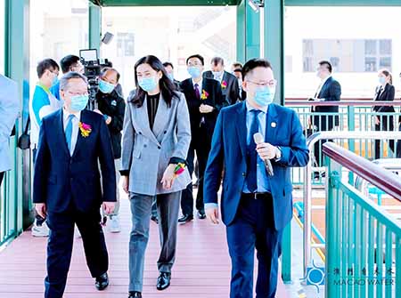 啟用典禮昨日(三十)日於路環九澳高頂馬路石排灣水廠舉行,採用「線上+線下」雙線並行的模式,讓未能親蒞的嘉賓透過直播共享盛事。典禮由立法會主席高開賢、珠海巿人民政府副巿長胡新天、海事及水務局局長黃穗文、珠海市人民政府二級巡視員何慶明、中央人民政府駐澳門特別行政區聯絡辦公室經濟部處長李偉、中華人民共和國外交部駐澳門特別行政區特派員公署辦公室副主任陳洪周、蘇伊士亞洲高級副總裁及蘇伊士中國水務運營總裁范曉軍、蘇伊士亞洲首席可持續發展及企業傳訊官趙雪梅以及澳門自來水執行董事關小冰主持揭幕。