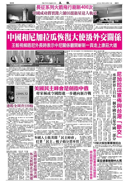 【香港中通社12月10日電】12月10日,中國同尼加拉瓜簽署《中華人民共和國和尼加拉瓜共和國關於恢復外交關係的聯合公報》。兩國政府決定自公報簽署之日起相互承認並恢復大使級外交關係。