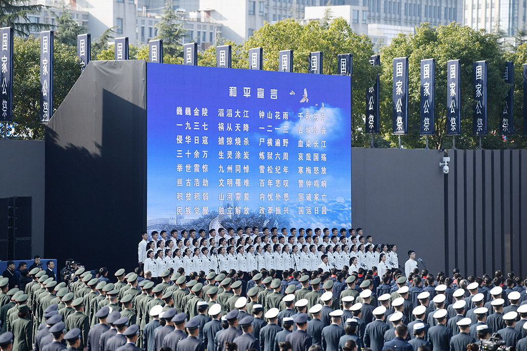 國行公祭,祀我殤胞。公祭儀式在侵華日軍南京大屠殺遇難同胞紀念館集會廣場舉行,現場莊嚴肅穆,國旗下半旗。約3000名胸前佩戴白花的各界代表靜靜肅立。