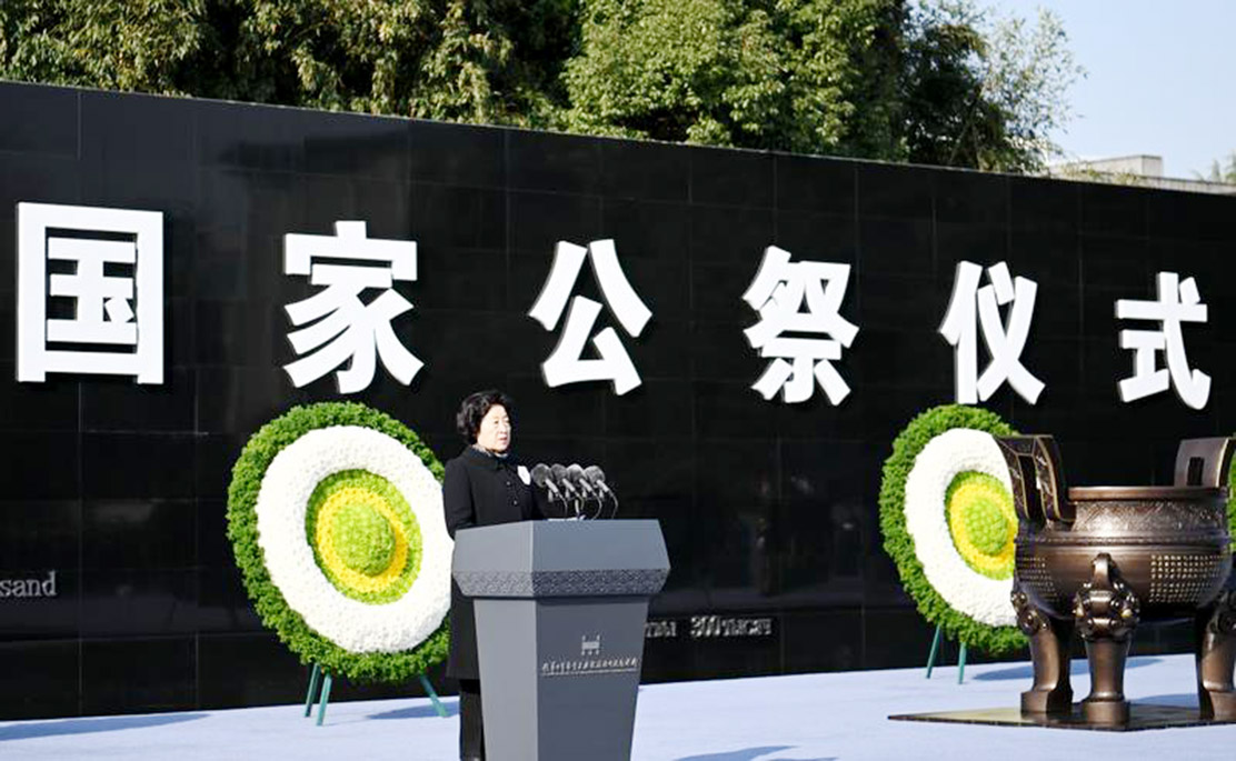 之後,孫春蘭發表講話。她表示,今天我們隆重舉行南京大屠殺死難者國家公祭儀式,深切緬懷南京大屠殺死難者,緬懷所有慘遭日本侵略者殺戮的死難同胞,緬懷為中國人民抗日戰爭勝利獻出生命的革命先烈和民族英雄,宣示中國人民以史為鑒、開創未來的莊嚴立場,表達堅定不移走和平發展道路的崇高願望。