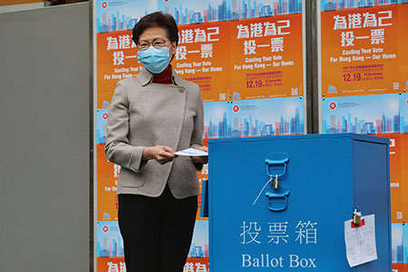 【中新社香港12月19日電】(記者 韓星童)12月19日,香港特區立法會換屆選舉舉行。上午約9時,香港特區行政長官林鄭月娥前往投票站投票,在其後會見記者時她表示,希望本屆選舉既公平公開公正廉潔,又有高效和具人性化的選務安排。