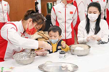 在街總石排灣家庭及社區綜合服務中心,國家奧運精英運動員代表團,包括乒乓球的許昕、游泳的湯慕涵、舉重的汪周雨和諶利軍等人,與約五十名市民交流互動,他們玩小遊戲和製作湯丸。