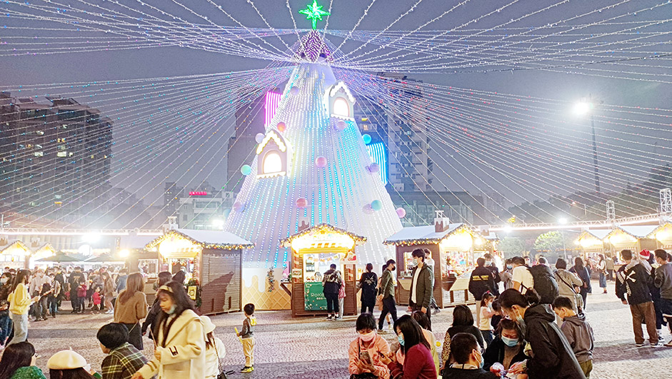 在塔石廣場舉行的聖誕市集人頭湧湧,由於防疫需要,現場需要進行人潮管制,場內的小食區迫滿購食品的人士,眾多家長帶同小朋友遊玩現場的旋轉木馬,非常高興,有市民稱,雖然有多天假期,但內地有疫情出現,所以與家人留澳歡渡假期,健康和安全最重要。