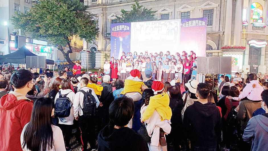 入夜後,議事亭前地及大三巴一帶在平安夜出現人潮,不少市民與旅客在光影節及聖誕燈飾之下拍照留念。有宗教團體於昨晚八時在大三巴牌坊耶穌會廣場舉行「2021歡樂佳音平安夜」的綜藝晚會,亦有宗教團體在議事亭前地獻唱詩歌,綜藝節目豐富,吸引大批市民及旅客駐足欣賞,十分熱鬧。街上聖誕燈飾璀燦亮麗,市面上洋溢一片濃厚的節日氣氛。