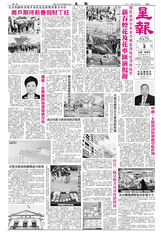 近日本澳各區人流明顯增多,節日氣氛不俗。據旅遊局公佈,除夕夜訪澳旅客錄得四萬二千三百四十一人次,是去年單日入境旅客第二高,重上四萬人次水平。過去一周,日均訪澳旅客亦達三萬零二百三十人次。昨日為內地元旦假期第二日,澳門半島和路氹各區人流頗多,氣氛熱鬧,特別是大三巴一帶,吸引不少旅客前來觀光和購物。有連鎖手信店店長胡先生反映,大三巴人流較平日增加兩至三成,元旦假期生意稍增,旅客人均消費只有疫情前約一半,但業界仍對農曆新年生意抱有希望。亦有手信店表示,與去年相比,今年回歸、聖誕和元旦假期人流確實明顯增多,但購買力始終不及疫情前,過去人均消費約五百至六百元,現在只有二、三百元。
