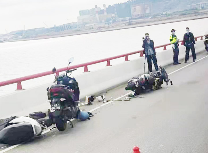 【特訊】友誼大橋澳門往氹仔方向近引橋,昨早發生三部電單車連環相撞意外,四人受傷,其中一名男司機倒地重創,無呼吸心跳,消防到場將其送院搶救,其他傷者亦一同送院。警方正調查意外起因。