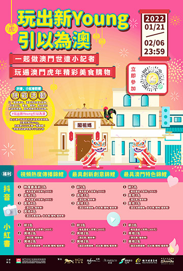 【特訊】旅遊局早前推出「玩出新Young 引以為澳」抖音、小紅書話題標籤挑戰,第三輪活動以「一起做澳門世遺小記者,玩遍澳門虎年精彩美食購物」為主題於今日(21日)起接續開展,歡迎有興趣人士參加。