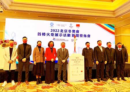 「2022年北京冬季奧林匹克運動會首棒火炬展示」新聞發佈會昨日上午在永利澳門宴會廳舉行,爲展期正式拉開帷幕,出席嘉賓包括:澳門體育局局長潘永權、中聯辦宣傳文化部副部長殷汝濤、永利渡假村(澳門)股份有限公司總裁兼常務董事陳志玲、以及澳門星娛樂製作有限公司行政總裁老傑龍。